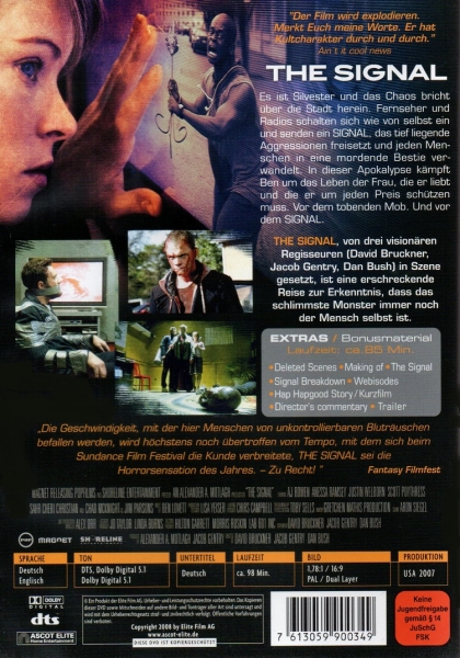 Es ist Silvester und das Chaos bricht über die Stadt herein. Fernseher und Radios schalten sich wie von selbst ein und senden ein SIGNAL, das tief liegende Aggressionen freisetzt und jeden Menschen in eine mordende Bestie verwandelt. In dieser Apokalypse kämpft Ben um das Leben der Frau, die er liebt und die er um jeden Preis schützen muss. Vor dem tobenden Mob. Und vor dem SIGNAL. THE SIGNAL, von drei visionären Regisseuren in Szene gesetzt, ist eine erschreckende Reise zur Erkenntnis, dass das schlimmste Monster immer noch der Mensch selbst ist.