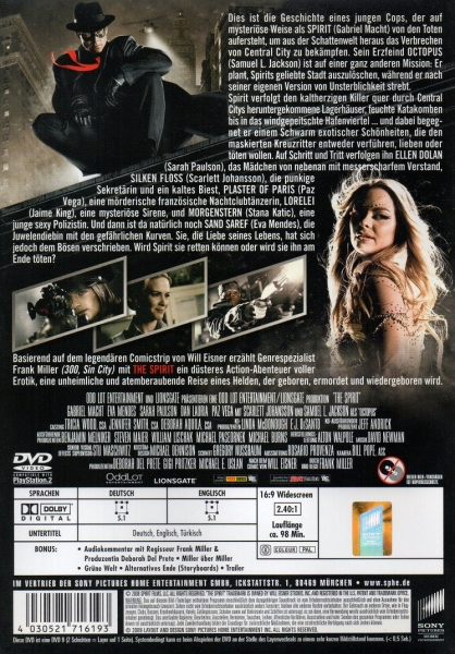 Dies ist die Geschichte eines jungen Cops, der auf mysteriöse Weise als SPIRIT (Gabriel Macht) von den Toten aufersteht, um aus der Schattenwelt heraus das Verbrechen von Central City zu bekämpfen. Sein Erzfeind OCTOPUS (Samuel L. Jackson) ist auf einer ganz anderen Mission: Er plant, Spirits geliebte Stadt auszulöschen, während er nach seiner eigenen Version von Unsterblichkeit strebt. Spirit verfolgt den kaltherzigen Killer quer durch Central Citys heruntergekommene Lagerhäuser, feuchte Katakomben bis in das windgepeitschte Hafenviertel ... und dabei begegnet er einem Schwarm exotischer Schönheiten, die den maskierten Kreuzritter entweder verführen, lieben oder töten wollen. Auf Schritt und Tritt verfolgen ihn ELLEN DOLAN (Sarah Paulson), das Mädchen von nebenan mit messerscharfem Verstand, SILKEN FLOSS (Scarlett Johansson), die punkige Sekretärin und ein kaltes Biest, PLASTER OF PARIS (Paz Vega), eine mörderische französische Nachtclubtänzerin, LORELEI (Jaime King), eine mysteriöse Sirene, und MORGENSTERN (Stana Katic), eine junge sexy Polizistin. Und dann ist da natürlich noch SAND SAREF (Eva Mendes), die Juwelendiebin mit den gefährlichen Kurven. Sie, die Liebe seines Lebens, hat sich jedoch dem Bösen verschrieben. Wird Spirit sie retten können oder wird sie ihn am Ende töten?