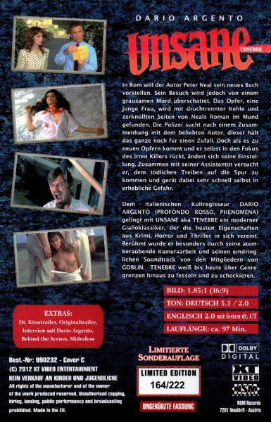 Dem italienischen Kultregisseur DARIO ARGENTO (PROFONDO ROSSO, PHENOMENA) gelingt mit UNSANE aka TENEBRE ein moderner Gialloklassiker, der die besten Eigenschaften aus Krimi, Horror und Thriller in sich vereint. Berühmt wurde er besonders durch seine atemberaubende Kameraarbeit und seinen eindringlichen Soundtrack von den Mitgliedern von GOBLIN. TENEBRE weiß bis heute über Genregrenzen hinaus zu fesseln und zu schockieren.