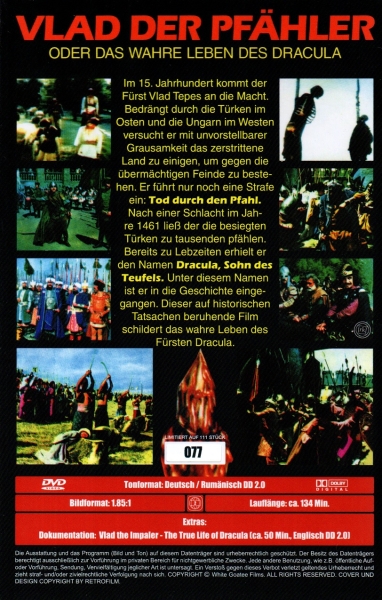 Im 15. Jahrhundert kommt der 'Fürst Vlad Tepes an die Macht. Bedrängt durch die Türken im Osten und die Ungarn im Westen versucht er mit unvorstellbarer Grausamkeit das zerstrittene Land zu einigen, um gegen die übermächtigen Feinde zu beste'hen. Er führt nur noch eine Strafe ein: Tod durch den Pfahl. Nach einer Schlacht im Jah're 1461 ließ der die besiegten Türken zu tausenden pfählen. Bereits zu Lebzeiten erhielt er den Namen Dracula, Sohn des Teufels. Unter diesem Namen ist er in die Geschichte eingegangen. Dieser auf historischen Tatsachen beruhende Film schildert das wahre Leben des Fürsten Dracula.