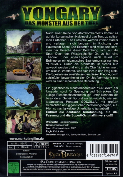 Nach einer Reihe von Atombombentests kommt es auf der koreanischen Halbinsel Li Lau Tung zu seltsamen Erdbeben. Die Experten sind ratlos und kommen der Ursache dieser Bedrohung nicht auf die Spur. Einer alten Legende nach lauert im Erdinneren ein gigantisches Sauriermonster namens Yongary. Durch die Atomtests ist dieses nun geweckt worden...